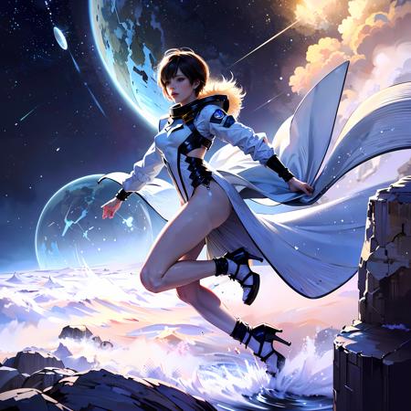 1 girl,(Destruction:1.3),(Interstellar War:1.3),War,(Alien and Human:1.2),Long hair,Curls,High-heeled shoes,Space Suit,Gelled Coat,lax,Fantasy, <lora:add_brightness亮度调整:1.2>