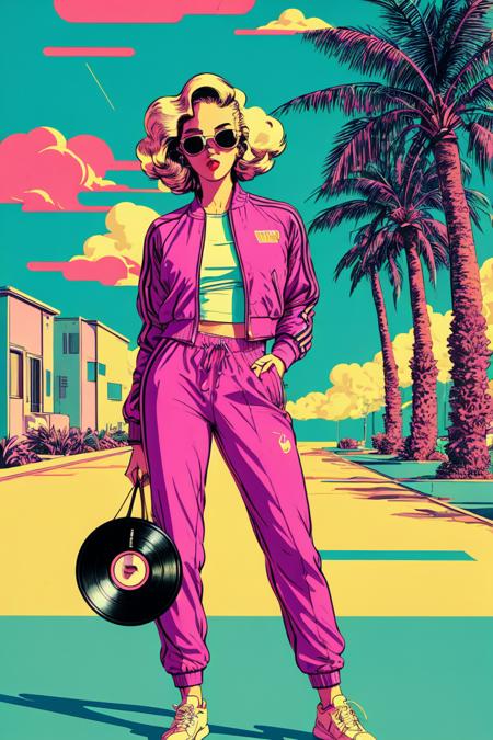 (((retro artstyle))) ((masterpiece)) A girl with blonde hair , sunglasses , retro track jacket , retro sweatpants , full body portrait , neutral expression , (vaporwave aesthetic) , palm trees , bust figure , vinyl records , japanese letters , vivid ,, <lora:add_detail:0.75>, <lora:FantasyWorldV1:0.25>,