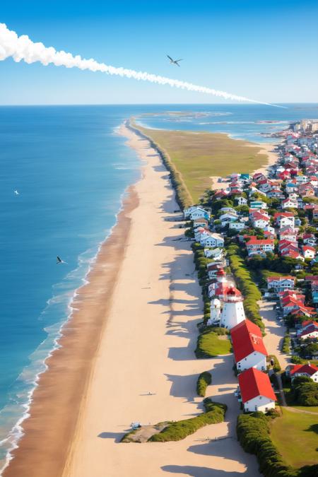 (masterpiece, best quality:1.1), bird's eye view, asymmetrical, blue ocean, low tide, sea waves, coastal road, sandy beach, piers, sailboats, yachts, ship wake, contrail, cars, tourists, lighthouse, seagulls, horizon, breeze, summer, morning, sunny, cloud, calm, fresh air, depth of field
