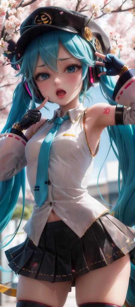 (masterpiece), (best quality), HDR, intricate detail, 1girl, bad_id, bad_pixiv_id, cherry_blossoms, finger_gun, gloves, green_hair, hanatachibana, hat, hatsune_miku, long_hair, open_mouth, peaked_cap, petals, pinwheel, senbon-zakura_(vocaloid), skirt, solo, thighhighs, torii, very_long_hair, vocaloid