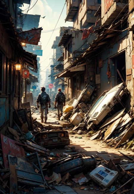 Punk, 1boy, garbage city, wrecked city, destroyed city, boy digging through junk, junkyard, cinematic lighting,lineart, monochrome