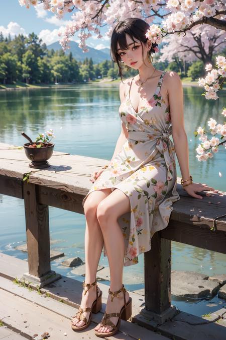 <lora:doll8:0.6>1 girl, cowboy_shot, Floral print wrap dress, Strappy sandals, Gold hoop earrings, and charm bracelet., Tranquil lake surrounded by blooming cherry blossoms,