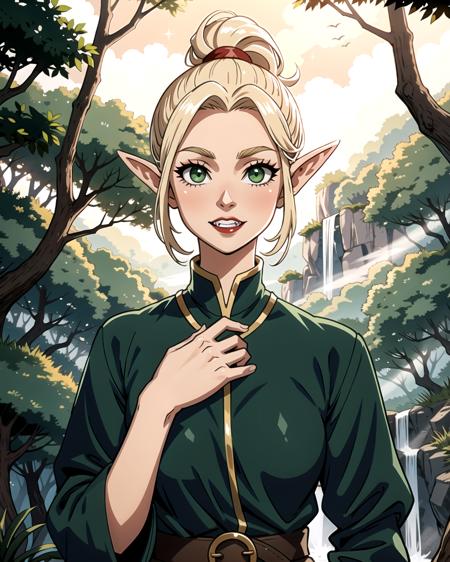 ((masterpiece), best quality, high quality, professional quality, highly detailed, highres, perfect lighting, natural lighting), unsettling, vampire with fangs, Dark Skin, Brunette with a high ponytail and sleek straight hair, orange velvet lipstick, A moonlit forest shrouded in mist, with a silhouette lurking in the distance, griffin,middle earth, Alchemist Mixing together volatile chemicals to create powerful explosives, Savior, Tall, Ripped, Oval Face, Tan Skin, Platinum Blonde Hair, green Eyes, Short Nose, Thin Lips, Round Chin, Chinstrap, Bald, Afro, A lush elven forest, filled with towering trees and sparkling streams, Tolkien
