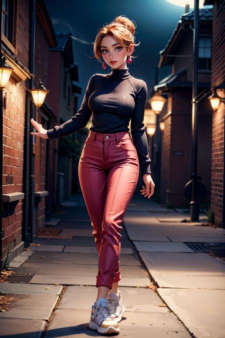 (best quality, highres, highly detailed, masterpiece:1.3), autumn, A lightweight knit sweater with corduroy pants and sneakers, Temptress, Average Height, Fit, Triangular Face, Tan Skin, Auburn Hair, silver Eyes, [[Curved Nose]], Thin Lips, Sharp Chin, Shoulder-Length Hair, Straight Hair, Ballerina Bun, natural breasts, Faux gauge earrings, cherry satin lipstick, <lora:smoke_model:0.4>, smokestyle, <lora:add_detail:0.7>