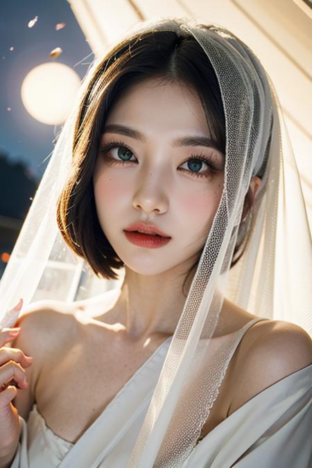 Strong male, green eyes, short silver hair, white robe, fov, f/1.8, masterpiece, (veil, mouth veil), blood moon, night, flower petals flying, front portrait shot, side light, moonlight shining on people, 8K