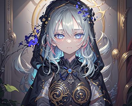(best quality, masterpiece), (1girl, solo, hood, expression face, standing, looking at viewer, half closed eyes, cap, blue eyes, long straight hair, closed mouth, upper body,), (cracked multicolored carved circle, white wall, ),