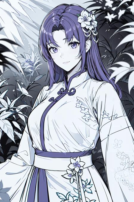 (masterpiece,best quality)),1girl, bangs, blurry background, dappled sunlight, flower, hair flower, hair ornament,chinese clothes, leaf, (maple leaf:1.9),outdoors solo, sunlight, upper body,beautiful face,dark purple hair,light purple eyes,zoom in on eyes,long hair,sideburns,straight hair,face to face,manly,medium breasts,mature female,voluptuous,hanfu,ming style, <lora:animeLineartMangaLike_v30MangaLike:0.8>,lineart, monochrome, <lora:CarolV3.5:0.7>,light smile,